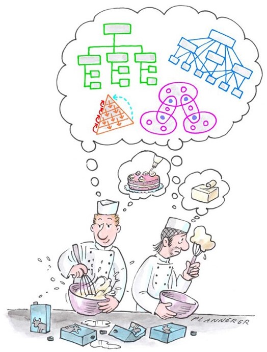 Mit Blick auf konkrete Organisationen können Sie die hier skizzierte Sahne- Metapher verwenden, um neue Perspektiven auf interne Strukturen, Veränderungsoptionen, Zwecke oder Beziehungen zur Umwelt von Organisationen zu entwickeln.